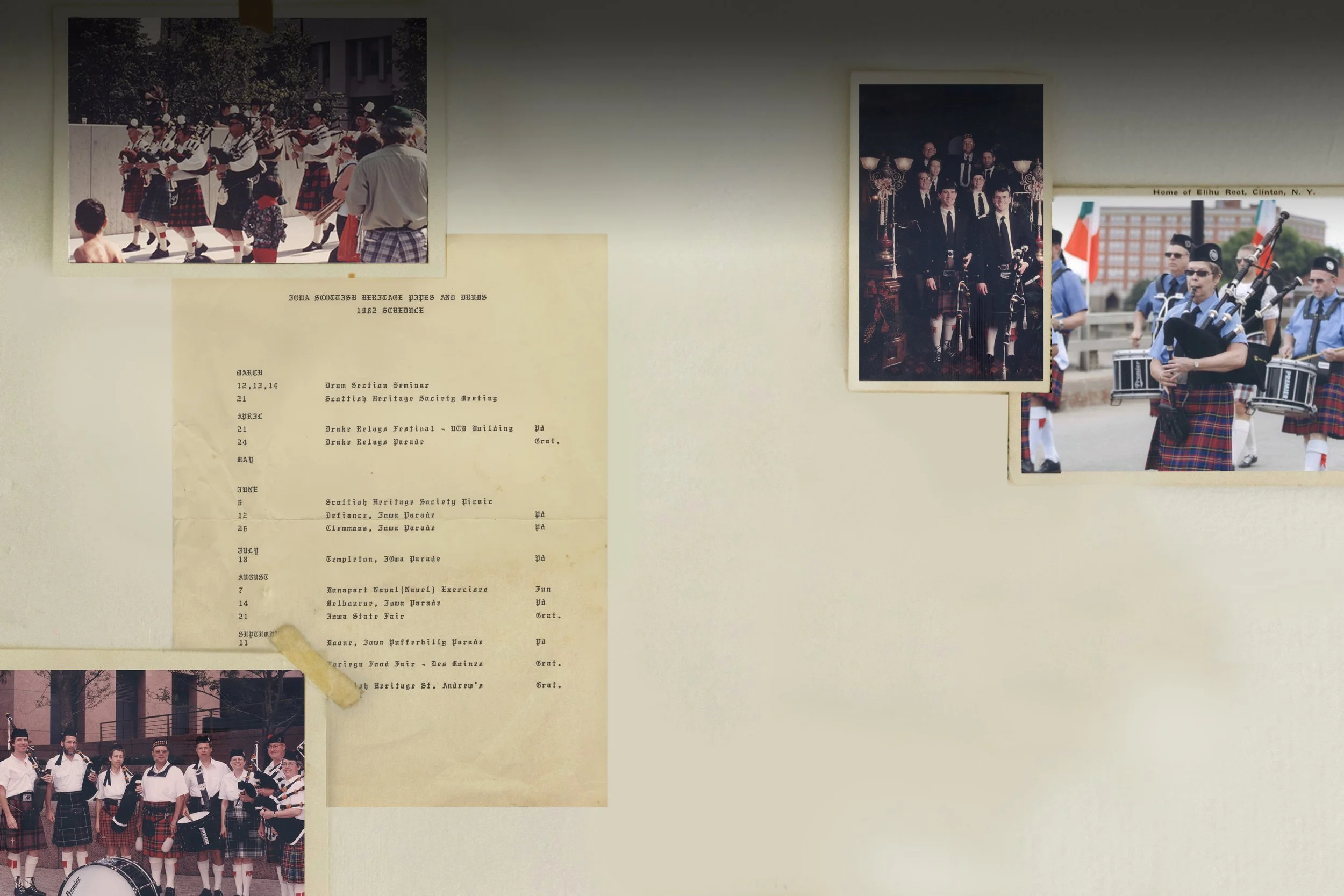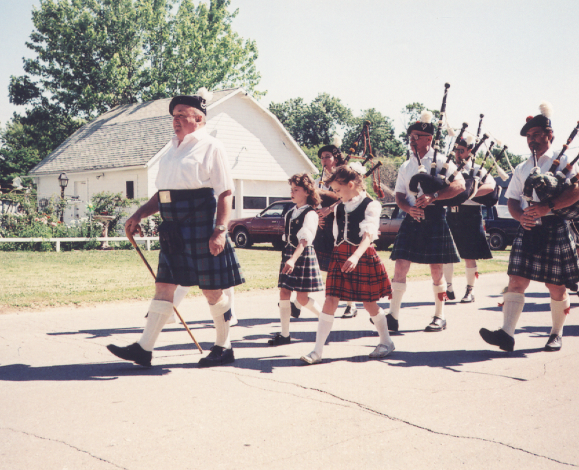 Tunes were standardized, drum scores were written, and the band continued to play at Scottish Heritage Society functions. Once word got around the band began receiving invitations to play for other events. One of the first paid performances was for a St. Patrick’s Day parade in Emmetsburg, IA. Centennial celebrations soon became common and the band played for several of these. Many festivals requested parade performances, including the Schaller Popcorn Days, the Pufferbilly Days in Boone, Tulip Time in Pella and the Irish Fest in Waterloo.