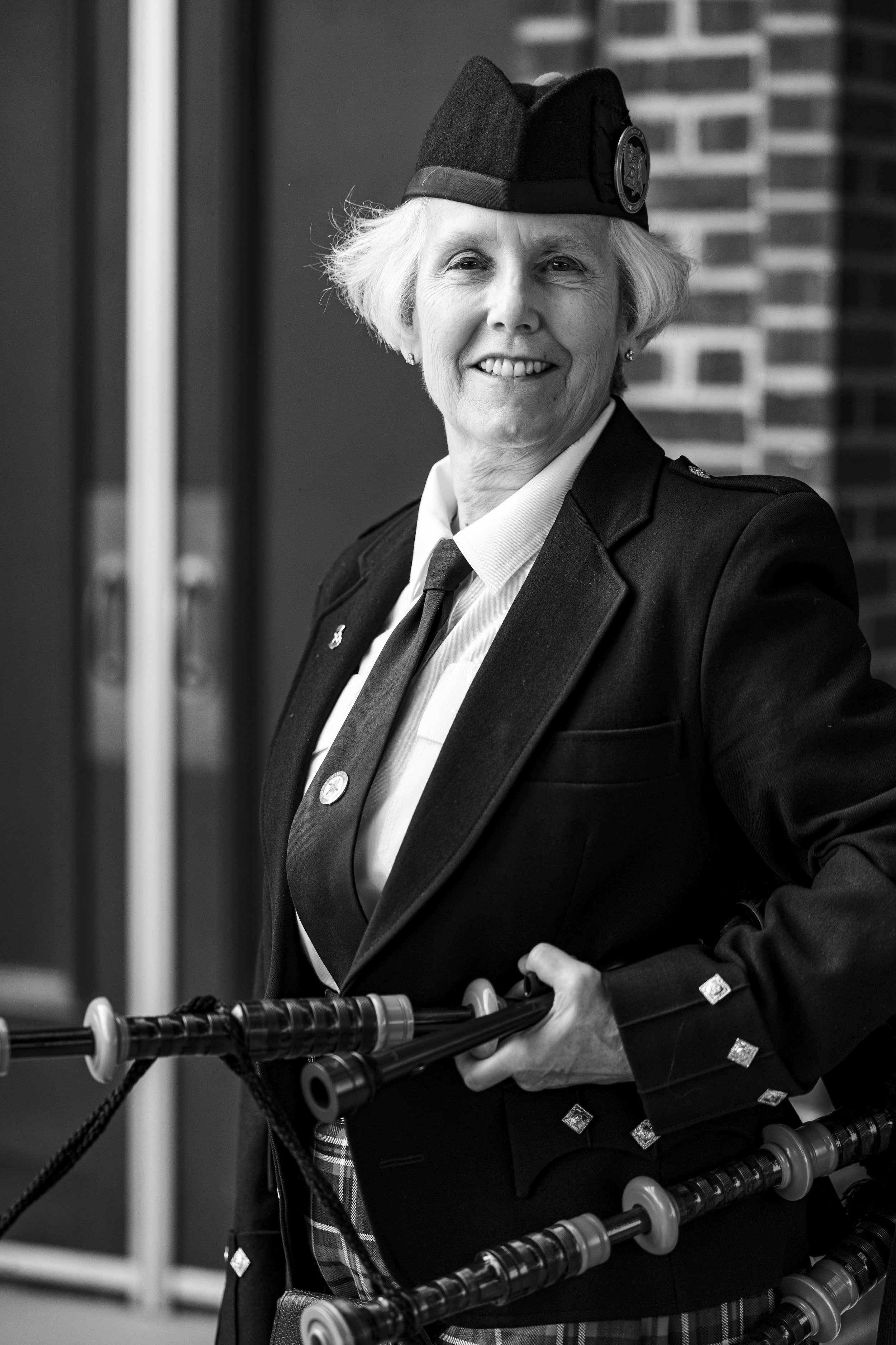 Many people have contributed to make Iowa Scottish Pipes and Drums what it is today, but probably the biggest contributor has been Susan Frambach. Like the vast majority of her fellow University of Iowa Scottish Highlanders, Susan had never seen a set of bagpipes before being accepted into the Highlanders. She rose to the rank of Pipe Sergeant and after graduation became a member of the Scottish Heritage Society in 1974 and started teaching lessons in her native Des Moines. She has taught an untold number of students, from elementary age to seniors in their 60’s and 70’s, and many of them eventually became skilled enough to play with the band. It’s not an exaggeration to say that Iowa Scottish Pipes and Drums would not exist without her contribution.