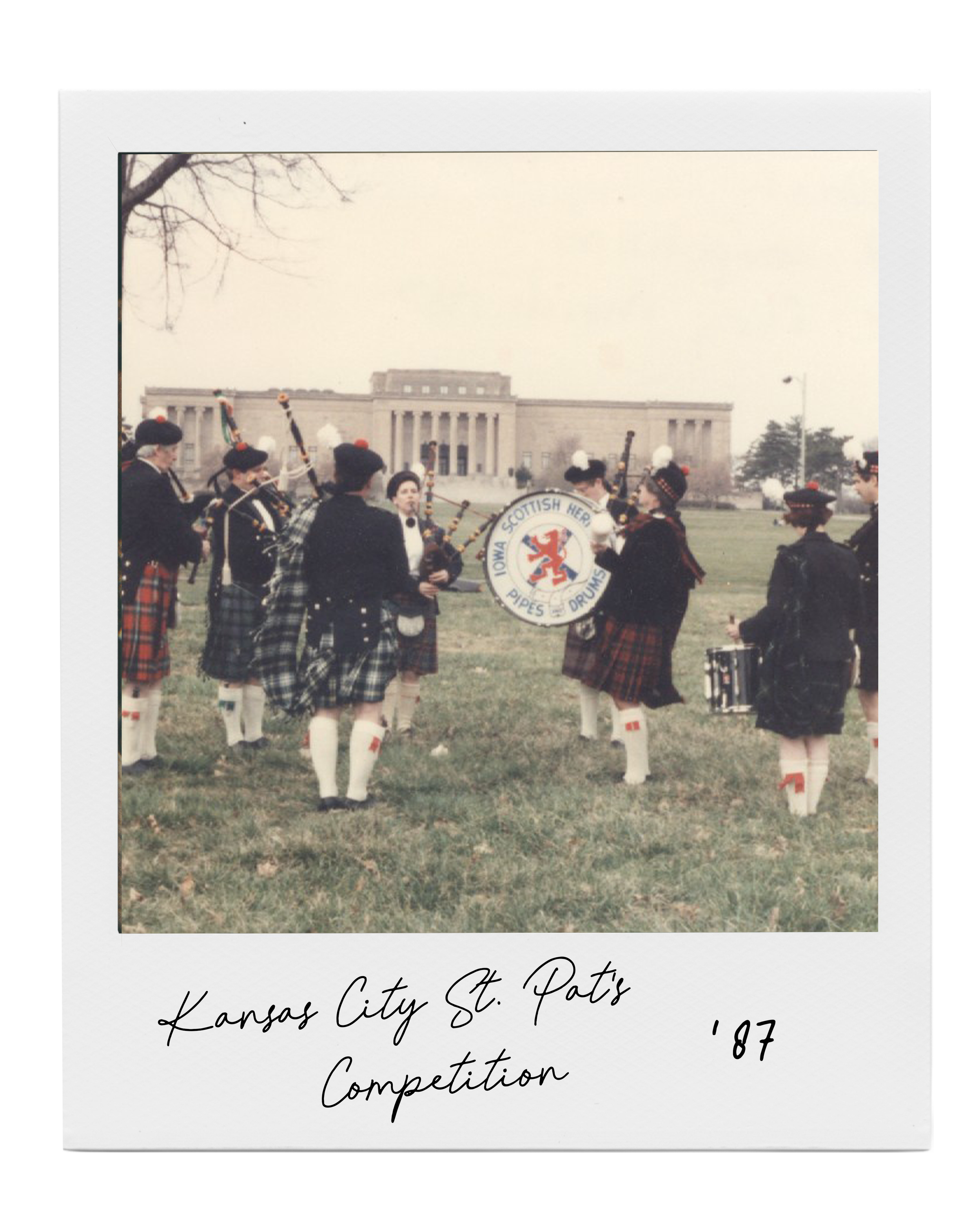 Kaye and Warren Caldwell returned home after attending a Scottish gathering in North Carolina. Their visit inspired them to determine if there would be enough interest in starting a Scottish society in central Iowa. They placed an ad in the Des Moines Register (the social media available at the time) and soon a group was formed. Among the initial respondents were several people who played the bagpipes, including members that had learned bagpiping from other bands like the Za-Ga-Zig Shrine pipe band and the University of Iowa Scottish Highlanders. Pipers would come and play for the meetings and found that they enjoyed playing together in a group. Once drummers started joining, a loan from the Society allowed the fledgling group to purchase unique Scottish-style drums. The group soon started practicing on their own and the Iowa Scottish Heritage Society Pipes and Drums was born. (Eventually the name was shortened to Iowa Scottish Pipes and Drums and the band was incorporated as a 501(c)(3) organization.)