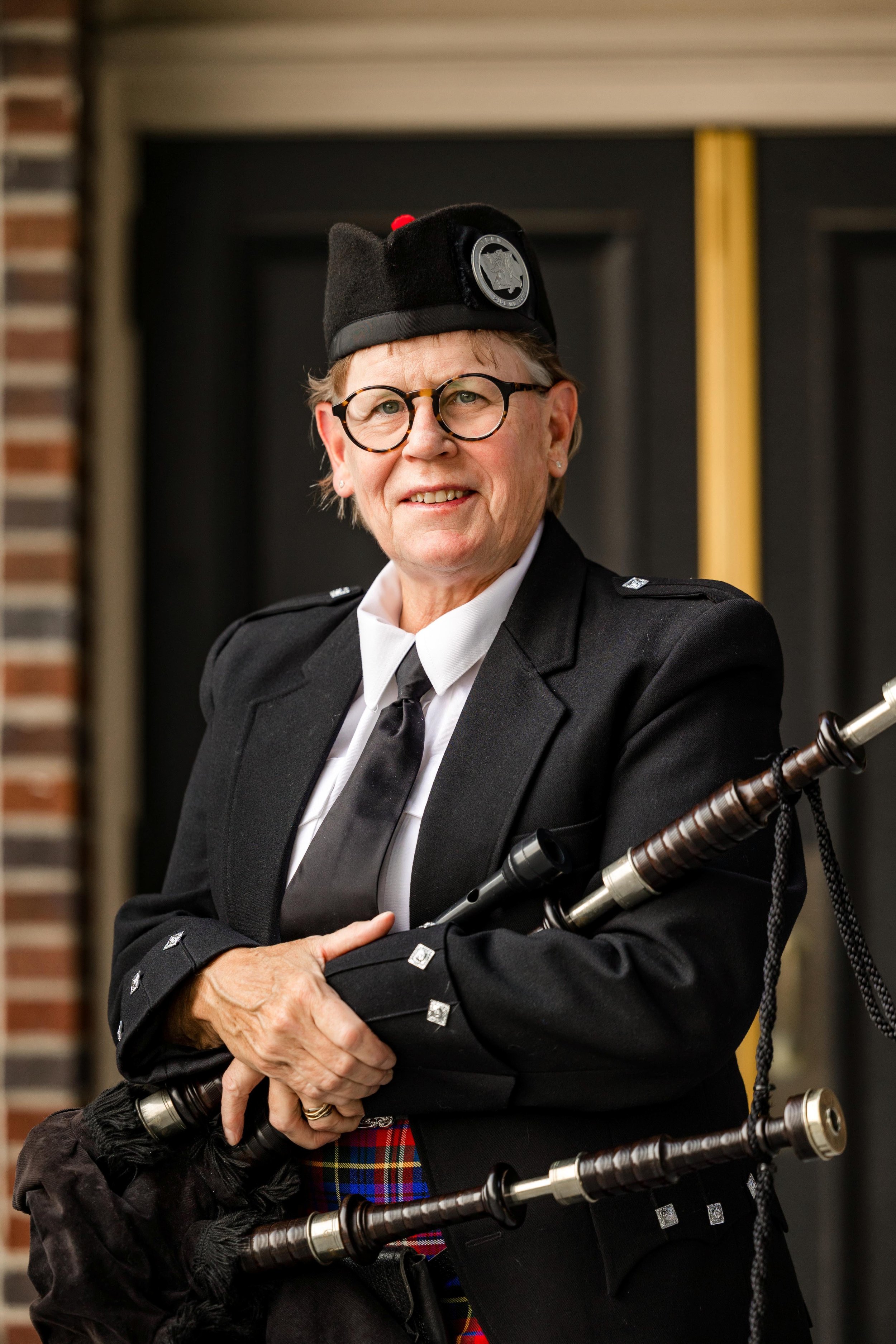 Sue explains, "My Mother made me do it!!" At her mother's suggestion, she joined the University of Iowa Scottish Highlanders, where she learned to play the bagpipes. After graduation, Sue helped found the Iowa Scottish Pipes and Drums and served as Pipe Major of the band. She has served as the President, Vice-President, Secretary and Society Piper for the Scottish Heritage Society of Iowa. Her first instrument was the piano and after learning the organ, she served as organist/choir director at St. Luke's Episcopal Church for 2 decades.
